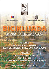 ‘Biciklistički pozdrav jeseni’ starta ispred spomenika poginulim hrvatskim braniteljima u 10h, a svi zainteresirani neka se jave na djuro.r@email.t-com.hr, ili na broj telefona 099/21 34 385, ili neka dođu ispred bivše vojarne pola sata prije početka biciklijade radi potpisivanja pristupnica. Kotizacije za sudjelovanje nema.