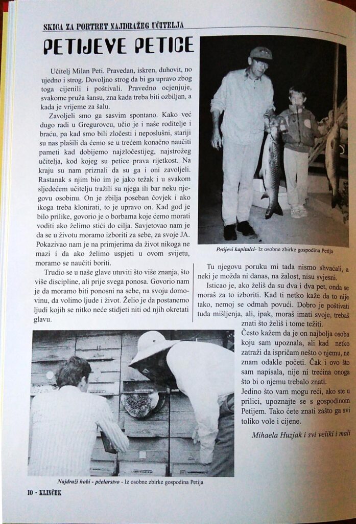 Na Gradskom groblju u Križevcima danas je bio posljednji ispraćaj učitelja Milana Petija. Učitelj Peti preko 40 godina radio je u PŠ Gregurovec gdje je naučio čitati, pisati i računati mnoge moje sumještane. Moja majka jučer se sjetila da je ona, dok je bila učenica Osnovne škole Sveti Petar Orehovec, pisala tekst o učitelju Petiju. Taj tekst objavljen je 1998. u trećem broju „Klinčeka“