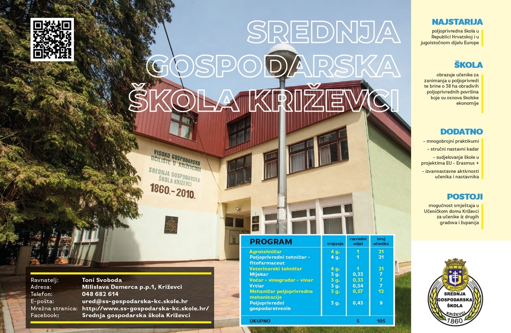 Upis u srednju školu jedna je od najvažnijih životnih odluka svakog osnovnoškolca, a obzirom da se klasična promocija upisa u srednje škole zbog izvanrednih okolnosti ove godine ne može realizirati, Koprivničko-križevačka županija će uz Vodič kroz srednje škole Koprivničko-križevačke županije 2020./2021. na svojoj internet stranici omogućiti srednjim školama da se predstave te na taj način učenicima olakšaju odluku u odabiru za njih najboljeg i adekvatnog srednjoškolskog programa. Danas svoje školske programe predstavlja Srednja gospodarska škola Križevci.