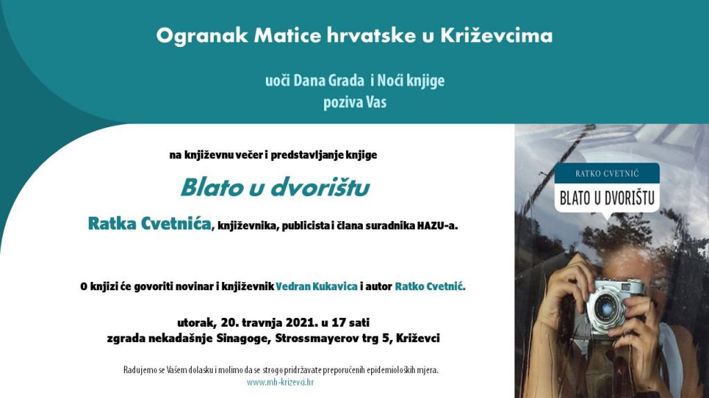 Ogranak Matice hrvatske u Križevcima uoči Dana Grada Križevaca i Noći knjige poziva na književnu večer i predstavljanje knjige „Blato u dvorištu” Ratka Cvetnića, književnika, publicista i člana suradnika HAZU-a. O knjizi će govoriti novinar i književnik Vedran Kukavica i autor Ratko Cvetnić.
