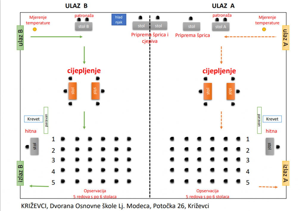 Punkt A – sjeverni ulaz (od strane Potočke ulice), cijepe se pacijenti sljedećih doktora: dr. Furmeg, dr. Črneli, dr. Berc, dr. Dbouk, dr. Cindrić, dr. Anđelić, dr. Kamenjašević, ZZJZ