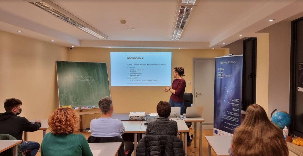 Dvadesetak polaznika različitih profesija, među kojima je bilo učenika, nastavnika, odgajatelja, komunikologa, šumara, agronoma, fizioterapeuta, prošlo je dvodnevnu radionicu socijalnih vještina koju je, u sklopu projekta Future Hub Križevci, proteklog vikenda organizirala udruga P.O.I.N.T. Edukaciju pod nazivom “Kakav dojam ostavljaš?- Primjena pozitivne psihologije u komunikaciji” održala je psihologinja Nikolina Mihić, zaposlena kao stručnjakinja za ljudske resurse, u slobodno vrijeme radi kao trenerica.