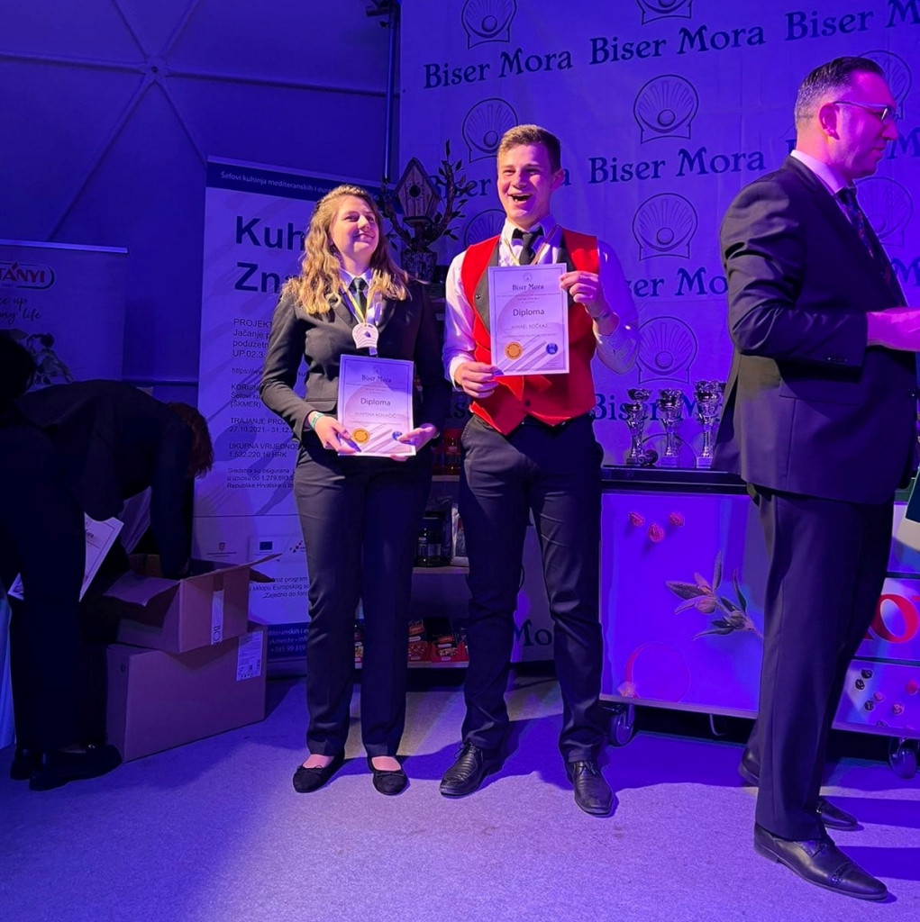 Svaki učenik trebao je prezentirati jela koja su karakteristična za njegov kraj ili za hrvatsku kuhinju, ali na moderan način. Naši kuhari kuhali su u timu, a zadatak im je bio u 120 minuta pripremiti hladno predjelo, glavno jelo i desert. Veronika i Antonelo su kuhali tatarski biftek od jadranske tune s mladim bobom i umakom od suhe rajčice, u glavnom jelu predstavili su kontinent pa su pripremili otkošteni batak i zabatak patke na kremi od krumpira i celera s kremom od buter tikve. Za desert su učenici pripremili modernu verziju pite od jabuka s kremom od šumskog voća, sve su servirali po pravilima struke i zaradili izvrsne ocjene žirija. U konkurenciji konobara natjecao se Mihael Bočkaj koji je flambirao jelo pred stolom gosta i otvarao pjenušac te za to osvojio zlatnu medalju. “Izvrsno smo se predstavili, naši učenici su pokazali što znaju i mogu. Rad i upornost su se isplatili i svi smo ponosni na naše učenike“, rekao nam je mentor učenicima kuharima Mišel Doskočil i dodao da su ovakva natjecanja izvrsna prilika za promociju struke i privlačenje mladih u kuharska i ugostiteljska usmjerenja jer je na tržištu rada sve veća potreba za strukovnim zanimanjima.