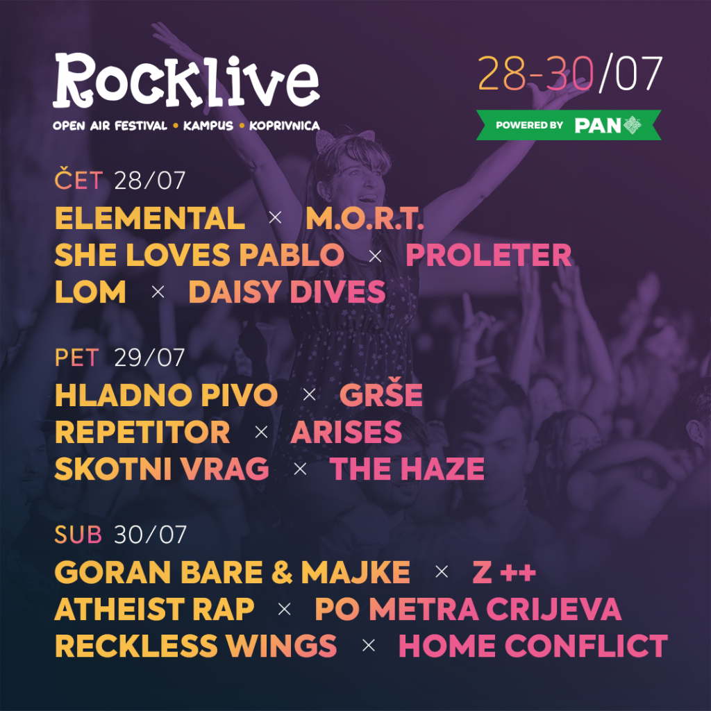 .RockLive Festival #11 u koprivničkom Kampusu počinje u četvrtak 28.7. kada se na pozornicu penju Elemental, M.O.R.T., She Loves Pablo, Proleter, a uz njih i posljednja dva najavljena izvođača, pobjednica HGF festivala Daisy Dives, te koprivnički bend LoM.