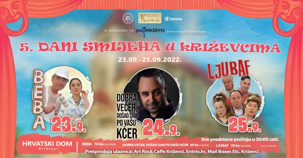 Od danas do nedjelje u Križevcima se održavaju “Dani smijeha” koje već petu godinu organiziraju udruga K.V.A.R.K., Pučko otvoreno učilište Križevci i Kerekesh Teatar. U programu manifestacije su tri predstave i to “Beba” večeras, “Dobra večer, došao sam po vašu kćer” sutra i komedija “Ljubaf” u nedjelju. Sve predstave igraju u Velikoj dvorani Hrvatskog doma od 20 sati i namijenjene su ljubiteljima komedija svih dobnih skupina.