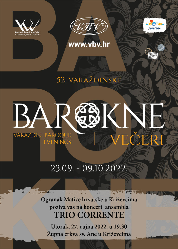 U sklopu 52. Varaždinskih baroknih večeri, koje već tradicionalno organiziraju i program izvan Varaždina, u utorak 27. rujna križevačkoj će se publici predstaviti Trio Corrente na kojem će posjetitelji čuti baroknu flautu, čembalo i violu da gamba.