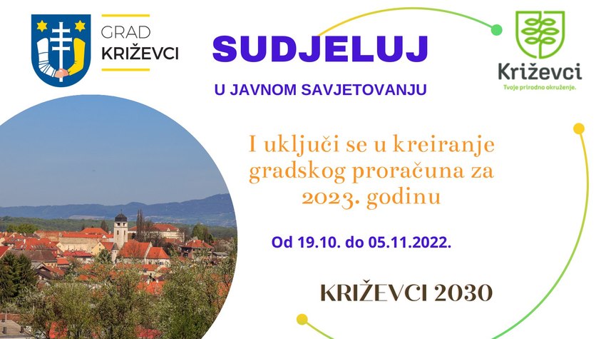 Grad Križevci poziva sve građane Križevaca da se svojim prijedlozima uključe u izradu Proračuna Grada za 2023. godinu putem digitalne platforme Sudjeluj! Križevci. Uključivanje javnosti u procese odlučivanja jedna je od temeljnih karakteristika transparentnosti jedinica lokalne samouprave što pridonosi jačanju demokracije i potiče izgradnju dobrih odnosa temeljenih na uzajamnom razumijevanju i povjerenju između javnog, poslovnog i civilnog sektora, navodi gradonačelnikov ured u priopćenju.
