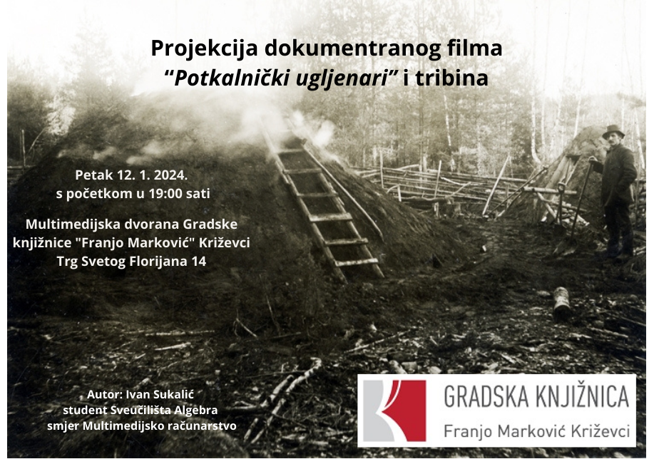 Gradska knjižnica poziva na projekciju dokumentarnog filma Potkalnički ugljenari u petak 12. siječnja s početkom u 19 sati u multimedijskoj dvorani. Film je završni rad Križevčanina Ivana Sukalića na Sveučilištu Algebra, a obuhvaća znanja stečena tijekom studija Multimedijskog računarstva. Tema filma je proizvodnja drvenog ugljena u vuglenicama, zidanim pećima kojih je nekad bilo puno u potkalničkim selima. Nakon filma slijedi tribina i domjenak.