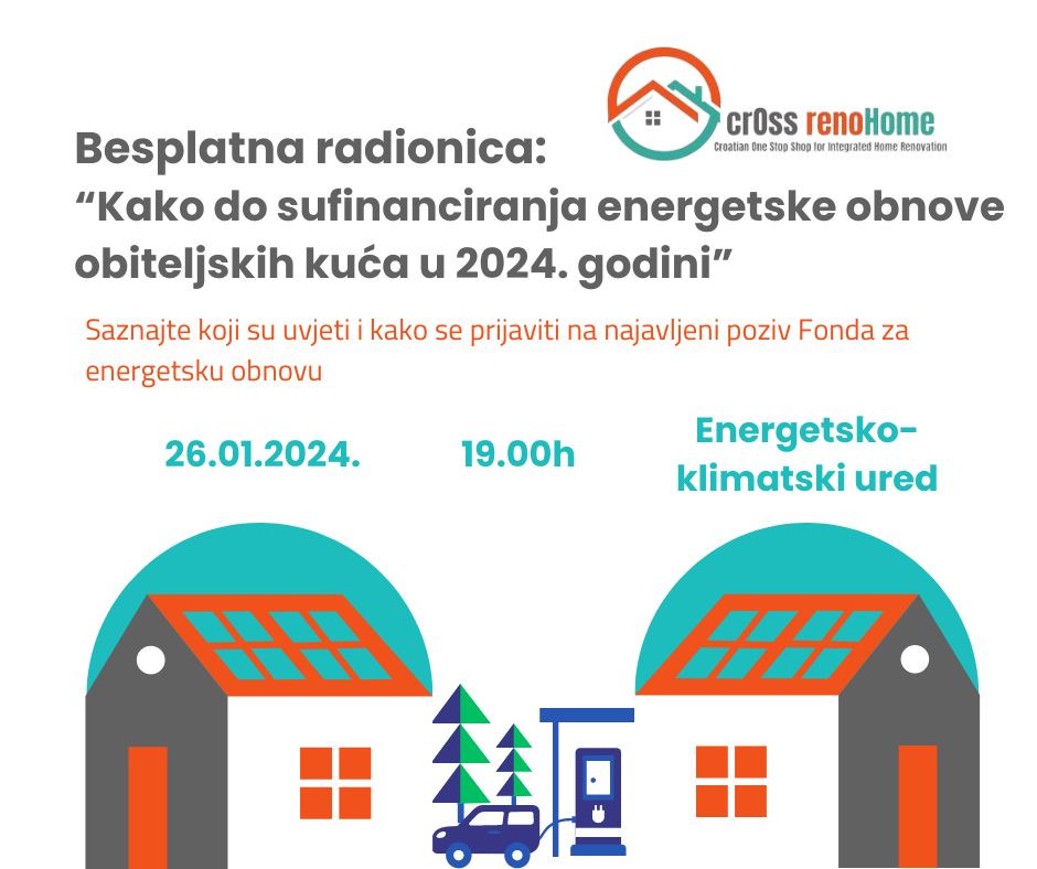 Energetska zadruga KLIK poziva građane na besplatnu radionicu na kojoj će doznati kako mogu energetski obnoviti obiteljske kuće uz pomoć države. Naime, Fond za zaštitu okoliša i energetsku učinkovitost objavio je uvjete i kriterije za sufinanciranje energetske obnove obiteljskih kuća, za koju je planirani budžet 120 milijuna eura, a poziv se planira objaviti najkasnije do konca veljače 2024.