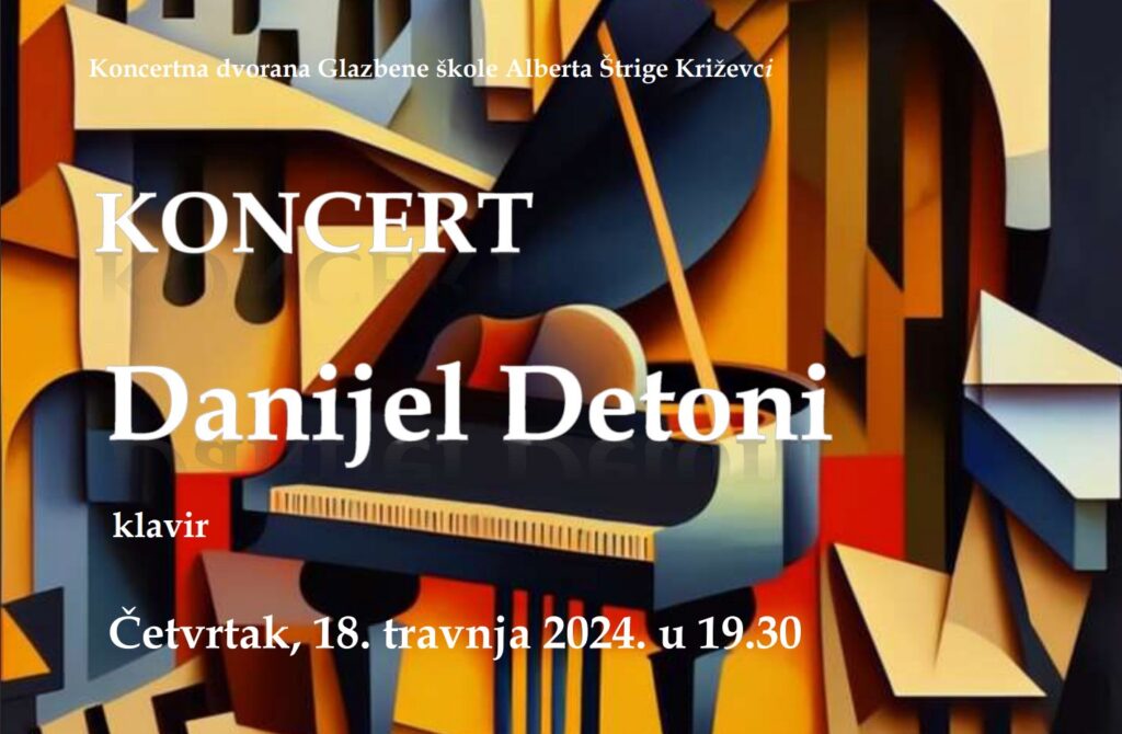 Glazbena škola Alberta Štrige poziva na koncert pijanista Danijela Detonija, večeras u koncertnoj dvorani u 19:30. Detoni je kao solist i komorni glazbenik gostovao na prestižnim festivalima poput Varšavske jeseni, Muzičkog biennala Zagreb, festivala Musica Danubiana u Ljubljani, Dubrovačkih ljetnih igara i mnogim drugima. Od ranih dana strastveni je komorni glazbenik, osvojio je nagrade u zemlji i inozemstvu, a Hrvatska glazbena mladež proglasila ga je najboljim mladim glazbenikom 2008. godine.