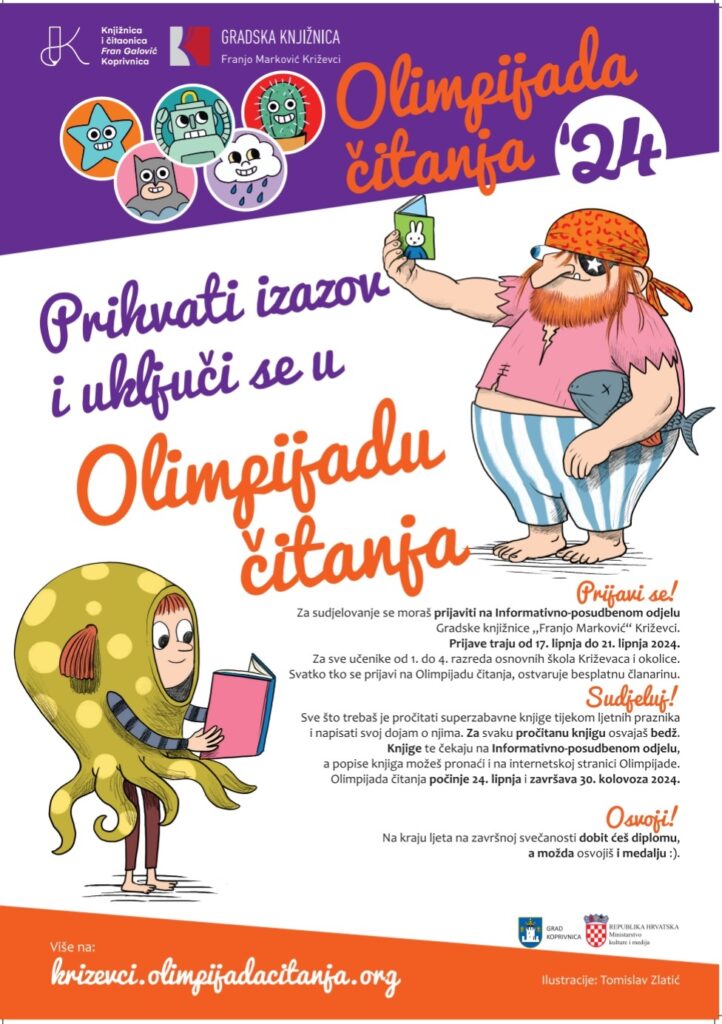 Osim u Parizu na sportskim terenima, olimpijada se ovoga ljeta održava i u Križevcima među mladim čitateljima. Naime, Gradska knjižnica “Franjo Marković” i ove godine organizira program Olimpijada čitanja kojem je cilj poticanje čitanja među djecom i razvijanje čitalačke navike uz besplatan program za kvalitetno provođenje ljetnih praznika. Sudjelovati mogu djeca od prvog do četvrtog razreda križevačkih osnovnih škola i okolice, prijave su već počele i traju do petka 21. lipnja, a natjecanje počinje u ponedjeljak 24. lipnja. Prijava je jednostavna: djeca se upisuju na informativno-posudbenom pultu, postaju službeni sudionici Olimpijade i preuzimaju dnevnik čitanja, a dodatno se mogu prijaviti i na web stranici i kreirati svoj profil: PRIJAVA/REGISTRACIJA.
