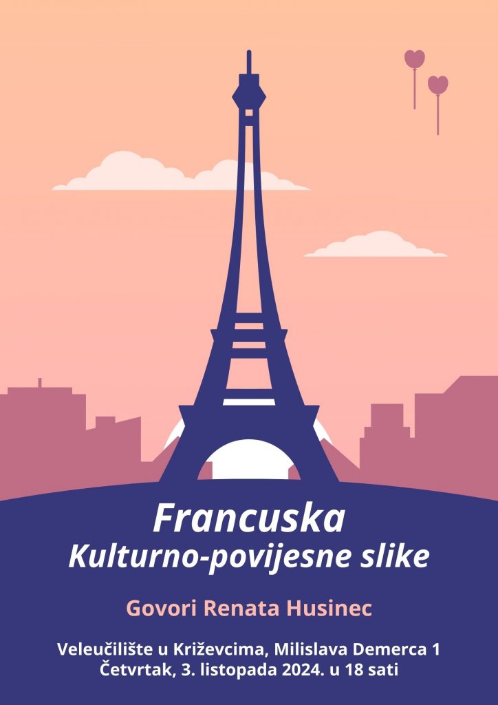 Ogranak Matice hrvatske u Križevcima poziva na predavanje “Francuska – Kulturno-povijesne slike” koje će se održati na Veleučilištu u Križevcima (Milislava Demerca 1) večeras, u četvrtak 3. listopada, u 18 sati. Govorit će Renata Husinec. Budući da je Francuska ove godina bila domaćin Olimpijskih igara, cilj predavanja je proširivanje znanja o toj zemlji.