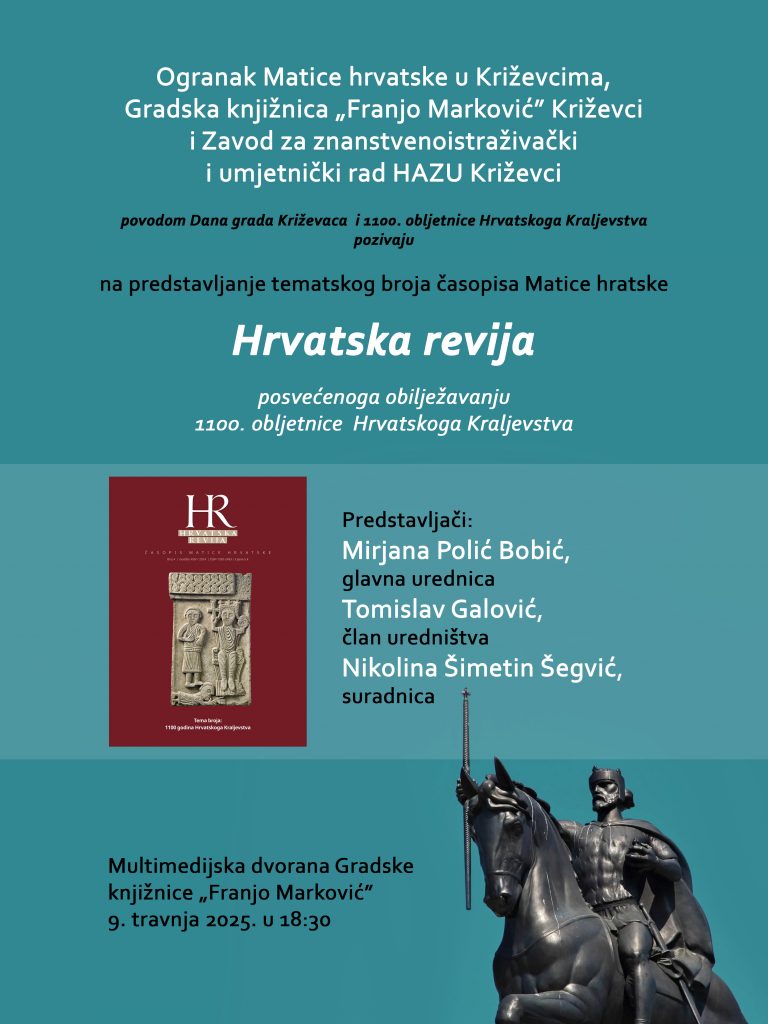Ogranak Matice hrvatske u Križevcima, Zavod za znanstvenoistraživački i umjetnički rad HAZU Koprivničko-križevačke županije i Gradska knjižnica „Franjo Marković“ pozivaju na predstavljanje tematskog broja časopisa Matice hrvatske Hrvatska revija posvećenoga obilježavanju 1100. obljetnice Hrvatskoga Kraljevstva i povijesnoj ličnosti kralja Tomislava i njegovom vremenu, povijesti proučavanja te problematike, povijesnom pamćenju i mitu o kralju Tomislavu u Hrvata, te prikazivanju Tomislavova lika i vremena u likovnim umjetnostima.