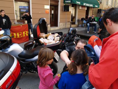 Članovi križevačkog Moto kluba Crusaders ponovno su se istaknuli kao darežljivi momci. Nakon što su pred Božić križevačkim mališanima kao motomrazovi dijelili bombone, danas su na središnjem gradskom trgu u Križevcima iz svojih motorističkih bisaga davali prigodne uskrsne darove.
