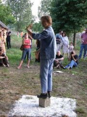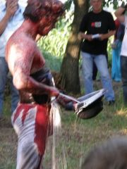 Naprotiv, ovaj šareni svijet privuklo je društvance neokonceptualnih umjetnika, mahom performera, koji se već treću godinu zaredom okuplja na obiteljskom imanju ‘Moja zemlja’ jedne od najeksponiranijih hrvatskih performerica, Vlaste Delimar. Bio je priređen cijelopopodnevni program uz druženje i performanse domaćih i inozemnih autora. Odgledao sam i kamerom zabilježio većinu nastupa, te naravno, s posebnim zanimanjem i nastup naše ‘domaće’ snage, Križevčanina Saše Živkovića, koji je također imao svoj performans. Nažalost, nisam uspio zabilježiti sve do kraja, jer sam želio svakako stići na jedan drugi performas koji je bio najavljen za istu večer, prijenos Thompsonovog koncerta, koji je ipak zbog nevremena odgođen za sljedeći dan. Bez direktnog prijenosa. Ali tako je u životu, čovjek snuje… No prije nego se osvrnem na događaj i posebno na neke pojedinačne nastupe, ipak imam potrebu komentirati činjenicu da se u Križevcima i oko Križevaca odjednom, gotovo za redom događa nekoliko stvari.