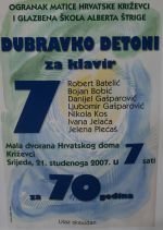 Povodom 70 godina života proslavljenog hrvatskog pijanista, rođenog Križevčanina Dubravka Detonija, sutra u 19 sati u Maloj dvorani Hrvatskog doma u Križevcima priređuje se glasovirski koncert njemu u čast.