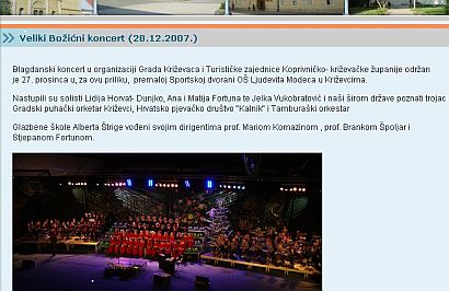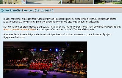 Naime, članak objavljen u petak 28. prosinca je, osim informacija prikazanih na sljedećoj slici, sadržavao i link (ili tzv. poveznicu) na Web stranice puhačkog orkestra. Zašto samo jedan link i zašto baš taj link?! Iz vrlo jednostavnog i praktičnog razloga: od svih navedenih izvođača u članku jedino gradski puhački orkestar ima vlastite službene Web stranice, a dobra je praksa Web medija da uvijek na taj način (tzv. linkanjem) ponude informaciju više, ukoliko takva postoji. Tom se dobrom praksom samoinicijativno poveo i održavatelj gradskih stranica, informatičar u gradskoj upravi.
