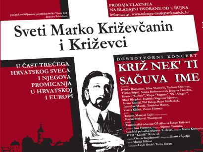 "Križ nek’ ti sačuva ime" naziv je velikog dobrotvornog koncerta koji će se danas, na sam blagdan Sv. Marka Križevčanina, od 20 sati održati u koncertnoj dvorani Vatroslava Lisinskog u Zagrebu, u čast trećeg hrvatskog sveca i njegova promicanja u Hrvatskoj i Europi. U dvosatnom glazbenom i scenskom programu nastupit će hrvatski pjevači različitih glazbenih usmjerenja zajedno s križevačkim glazbenicima i društvima, a kao posebni gosti izdvojeni su Tatjana Matejaš Tajči, koja će se uključiti video vezom, te Marko Perković Thompson, koji je noćas održao cjelovečernji koncert i u Križevcima.