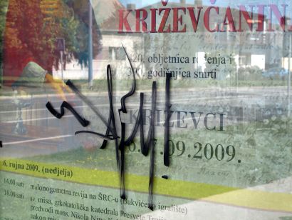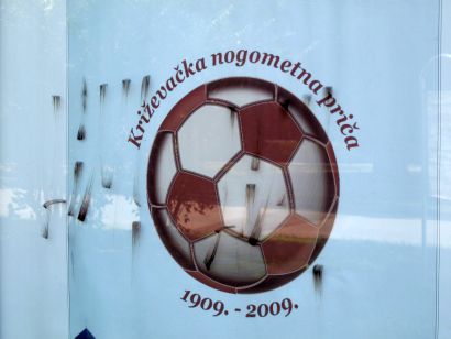 – “Ova situacija traje posljednjih osam mjeseci. Čim očistim površine, kroz tjedan dana opet osvanu natpisi”, iznosi Mikinac. Napominje da je o svemu obavijestio križevačku policiju, a on bi, kako kaže, i sam žarko želio upoznati neshvaćenog umjetnika. Naša kamera zabilježila je išarane površine u trenutku kad su na njima oglašavani Dani sv. Marka Križevčanina i najava knjige “Križevačka nogometna priča 1909.-2009.”.