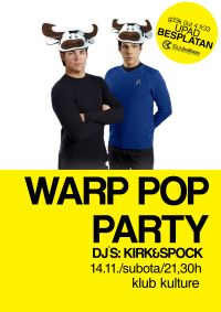 Za sve ljubitelje spejs-nigrutinskog žljuta, drum’n’bassa na warp pogon i rock’n’roll fazora, dva selektora u jednoj duši Kirk&Spock nude vam svoju verziju USS Enterprisea, ludog i otkačenog tuluma predvođenog s DJ mosta odakle će se taktički upravljati kvalitetnim odabirom glazbenih brojeva koji će atmosferu dovesti do neslućenih razmjera Gama kvadranta. Subotnji ulaz u križevački Klub kulture je slobodan za sve izdanke svih vrsta, od ljudske do tuđinske.