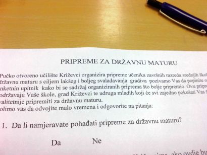 Početkom studenog najavili smo pokretanje organiziranih priprema križevačkih maturanata za državnu maturu, koja će se u Hrvatskoj prvi put održati iduće godine, a vrjednovat će se za upis na gotovo sve fakultete hrvatskih sveučilišta. U Križevcima će se tako od ove subote pa sve do kraja svibnja 2010. održavati pripreme iz obaveznih predmeta – matematike i hrvatskog jezika te engleskog i njemačkog jezika, za koje su obuhvaćene i osnovna i viša razina, ovisno o izboru polaznika. Maturanti će također moći odabrati poneki od izbornih predmeta – fiziku, kemiju i biologiju, ukoliko im je potreban za upis željenog fakulteta.