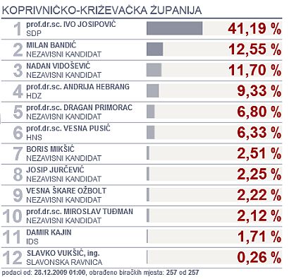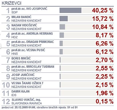 Prema privremenim službenim rezultatima za predsjednika Republike Hrvatske koje je Državno izborno povjerenstvo objavilo odmah iza ponoći, u drugi izborni krug, koji će se održati 10. siječnja 2010. godine, plasirali su se kandidat SDP-a prof.dr.sc. Ivo Josipović s 32,44% glasova birača te nezavisni kandidat Milan Bandić s 14,84% glasova ukupno 1.952.510 birača iz Hrvatske. U Križevcima s ukupno 18.462 birača glasovanju na 51 biračkom mjestu pristupilo je i korektno glasovalo njih 9.172, od kojih 40,25% za Josipovića, 15,72% za Bandića, a 10,84% za nezavisnog kandidata Nadana Vidoševića. Četvrti je prof.dr.sc. Andrija Hebrang iz HDZ-a s 8,17% glasova birača, peti nezavisni kandidat prof.dr.sc. Dragan Primorac s 6,26%, a šesta prof.dr.sc. Vesna Pusić iz HNS-a sa 6,12% osvojenih glasova Križevčana.