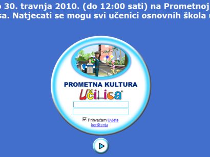 Danas točno u podne preko Interneta kreće natjecanje iz poznavanja prometnih propisa za sve učenike osnovnih škola u Hrvatskoj. Riječ je o web-projektu “Prometna učilica”, koji i ove godine provodi Ministarstvo unutarnjih poslova u suradnji s Ministarstvom znanosti, obrazovanja i športa i tvrtkom Markot.tel, a uz podršku Hrvatske akademske i istraživačke mreže – CARneta. Sve do 30. travnja osnovnoškolci Hrvatske će kroz poučne sadržaje i pitanja za provjeru znanja tematski obraditi kretanje pješaka u prometu i vožnju bicikla.