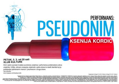 Prvi petak ovogodišnjeg Culture Shock Festivala u Klubu kulture predstavit će dvoje poznatih hrvatskih suvremenih umjetnika i performera, Kseniju Kordić iz Zagreba i Marijana Crtalića iz Siska. Kordić se od 1999. svoje radove na područjima video-instalacija, fotografije, performansa, scenografije i dizajna predstavljala na dvadesetak izložbi, akcija i kolonija u zemlji i inozemstvu, a križevačkoj će se publici predstaviti performansom “Pseudonim”. Na koji način autorica problematizira odnos umjetnika i tržišta može se pogledati od 20 sati, a ulaz je slobodan.