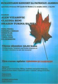 Križevčanka Patricija Jambrec, rođena s čeljusnom artrezijom, prošle je godine u Francuskoj obavila prvu operaciju gornjeg dijela lica, a potrebna su još tri kirurška zahvata kako bi se spriječile daljnje zdrasvtvene komplikacije. Prva od operacija donjeg dijela čeljusti zakazana je u srpnju ove godine i iznosi 8 tisuća eura, za što su Visoko gospodarsko učilište Križevci zajedno sa Studentskim zborom odlučili organizirati humanitarni koncert u nedjelju 7. ožujka 2010. s početkom u 19 sati u velikoj školsko-športskoj dvorani OŠ Ljudevita Modeca.