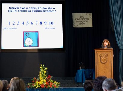 Radni dio programa, koji su vodile učiteljice Ivka Kajganić i Suzana Balić, započet je predavanjem Dubravke Miljković, profesorice na Učiteljskoj akademiji i Kineziološkom fakultetu u Zagrebu, na temu Sreća i zdravlje. Miljković je u zanimljivom i dinamičnom izlaganju istaknula da sreća (dubok i trajan osjećaj da je život dobar, ispunjavajuć, smislen i ugodan) utječe na zdravlje jer sretni ljudi teže obolijevaju, brže se oporavljaju ako se razbole i uglavnom duže žive. Osim toga, sretni ljudi su kreativniji i općenito boljeg raspoloženja, a to su poželjne osobine svakoga učitelja. Dobro raspoloženje slušatelja izazvale su dječje izreke o tome što je sreća i šaljiva poruka na kraju predavanja: Ujutro progutaj žabu… nakon toga ništa ne može biti gore!