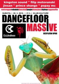 Soundsystem iz Kingstona dolazi u subotu 20. ožujka 2010. u križevački Klub kulture u pojačanom izdanju napraviti još jedan vrhunski tulum koji se skriva pod radnim nazivom Dancefloor Massive. Tko sve dolazi? Prince Shango, selektor koji jako voli roots reggae, rub-a-dub, dancehall i slične jamaica stilove. Big boss kolektiva JinSan, osnivač Kingston shopa/labela te jedan od DJ pionira u Hrvatskoj koji vrte dancehall i jungle. Po prvi put u Križevcima, najveća nadolazeća zvijezda hrvatske drum’n’base&jungle scene Filip Motovunski koji osim što jako voli gramofone ima i nos za produkciju pa mu je nedavno objavljen EP “Ta Pa Tap” za svjetski renomirani label Jungle Xpeditions, a uskoro možemo očekivati i njegov vlastiti album.