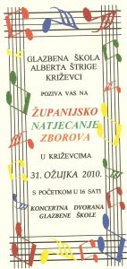 Križevačka Glazbena škola Alberta štrige sutra je domaćin natjecanja zborova Koprivničko-križevačke županije. Točno dva tjedna nakon svečanog otvorenja, novouređena će Koncertna dvorana ugostiti zborove u dvije kategorije: u onoj nižeg uzrasta na Županijskom natjecanju zborova sudjeluju tri križevačka dječja zbora, iz OŠ ”Vladimir Nazor” i OŠ Ljudevita Modeca te Dječji zbor Glazbene škole. Među zborovima višeg uzrasta natječu se zbor Osnovne škole ”Fran Kancelak” iz Drnja i Djevojački zbor Gimnazije Dr. Ivana Kranjčeva iz Đurđevca. Zborske pjevačke svečanosti počinju u 16 sati.