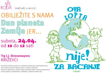 Udruga RODA i ove godine obilježava Dan planeta Zemlje u osam hrvatskih gradova, među kojima su i Križevci. Iz udruge pozivaju na njihov štand koji će biti postavljen sutra, u subotu, na Strossmayerovom trgu od 10 do 12 sati. Roditelji i sve zainteresirani će se moći upoznati s prednostima modernih platnenih pelena te pogledati i kupiti pelene marke “Rodina pusa” od različitih prirodnih materijala.