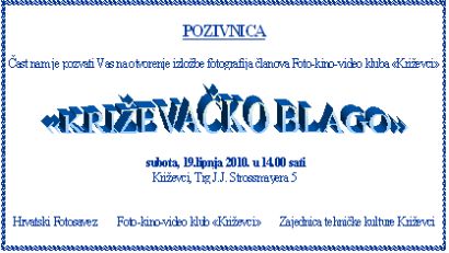 Foto-kino-video klub “Križevci” u suradnji sa Zajednicom tehničke kulture Križevci poziva na otvorenje izložbe fotografija “Križevačko blago”, koje će se održati u subotu 19. lipnja 2010. u 14 sati u zgradi bivše križevačke sinagoge na Strossmayerovom trgu. Okom kamere zabilježene motive iz bogate kulturno-povijesne baštine grada i okolice izlažu mladi članovi kluba, polaznici fotoradionice koja se prošlog vikenda održala pod okriljem Hrvatskog Fotosaveza. Izložba će u sklopu 43. Križevačkog Velikog spravišća biti otvorena u subotu od 14-19 sati i nedjelju od 11-18 sati, a subotnjem otvorenju prethodit će radionica izrade kemograma “Ostavi trag!” koja počinje u 10 sati.
