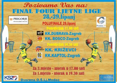KK “Križevci” pozivaju ljubitelje košarke na Final Four Ljetne lige Košarkaškog saveza Zagreba koji se će održati u ponedjeljak i utorak u dvorani OŠ Ljudevita Modeca u Križevcima. Susreti polufinala na rasporedu su sutra, i to u 17 sati između KK “Dubrava” i KK “Bosco” te u 19:30 sati između KK “Križevci” i KK “Kaptol”. Utakmica za 3. mjesto se igra u prekosutra u 17, a finale u 19 sati.