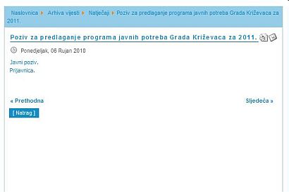 S posebnom pozornošću ove sam godine pratio kada će Grad objaviti POZIV za predlaganje programa javnih potreba Grada Križevaca u 2011. godini, da kao zainteresirani pojedinac, ponovim svoju zamolbu od lani. Poučen prošlogodišnjom odbijenicom (doduše bez pisanog odgovora na pisani podnesak), rekoh sam sebi, moram pažljivije proučiti propozicije prije nego se (ako) ponovo javim na POZIV.