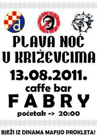 Križevački Bad Blue Boys, navijači Građanskog nogometnog kluba “Dinamo”, pozivaju u subotu 13. kolovoza na “Plavu noć” koje će se održati u novootvorenom caffe baru “Fabry” u centru Križevaca. Ovogodišnje druženje navijača zagrebačkog prvoligaša, čija uprava praktički besplatnim ulaznicama za međunarodne utakmice posljednjih mjeseci puni stadion Maksimir, održava se pod nazivom “Godina bojkota”. Uz popularne cijene pića, bit će poslužena i besplatna hrana, a zainteresirani će se moći upoznati s aktivnostima građanske inicijative Zajedno za Dinamo. Okupljanje kreće od 20 sati.