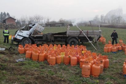 Vozeći neprilagođenom brzinom 23-godišnji M. P. iz Zagreba u utorak oko 14.30 sati u Poljani Križevačkoj izgubio je nadzor nad kamionom (Mercedes), kojim je prevozio plinske boce, te je sletio s ceste. Kamion je u nesreći potpuno uništen, a svih 336 boca plina popadalo je na zemlju. Materijalna šteta je velika.