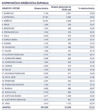 Državno izborno povjerenstvo Republike Hrvatske objavilo je u 20 sati privremene neslužbene rezultate državnog referenduma o pristupanju Republike Hrvatske Europskoj uniji, prema kojima je 67,11 birača glasalo za Europsku uniju, dok je 32,36% bilo protiv. Ovo su prvi objavljeni rezultati na temelju obrađenih nešto više od četvrtine glasačkih mjesta. Prema priopćenju o tijeku provedbe referenduma i odazivu birača, na području Križevaca je do 16 sati na ukupno 51 glasačkom mjestu glasovalo 6.206 ili 33,75% birača, što je praktični jednako odzivu birača na državnoj razini. Objava potpunih neslužbenih rezultata očekuje se u 22 sata.