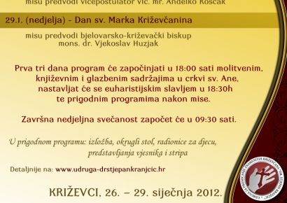 Program se nastavlja i u petak, subotu i nedjelju, a posljednjeg dana misno će slavlje predvoditi bjelovarsko-križevački biskup mons. Vjekoslav Huzjak, nakon čega će biti predstavljen strip ‘Sveti Marko Križevčanin’. Četvrte Dane hrvatskih svetaca i blaženika pod pokroviteljstvom Bjelovarsko-križevačke biskupije te uz potporu Grada Križevaca i Koprivničko-križevačku županiju, uz brojne suradnike, organiziraju dvije križevačke župane te Udruga za promicanje znamenitih Križevčana ‘Dr. Stjepan Kranjčić’. (RKC)