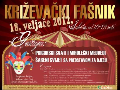 Križevci će u subotu, 18. veljače 2012. od 10 do 12 sati pokušati probuditi uspavane zimske, snježne mjesece organizacijom Križevačkog fašnika. Uz lokalne maskirane grupe djece i odraslih, u goste dolaze i „Prigorski svati“ iz Sv. Petra Orehovca i Miholečki Medvedi maskirani u pletenice od sijena i slame, te glumci KUD-a Kalnik sa šaljivim skečevima. Velika maskirana fašnička povorka praćena križevačkim mažoretkinjama, bubnjarem, puhačima, vrtićima i školama, kostimiranim jahačima i kočijama krenuti će u 10 sati od Vatrogasnog doma prema Trgu J.J.Strossmayera gdje će se održati vjenčanje mladenaca „Prigorski svati“.