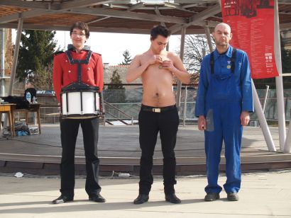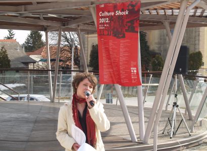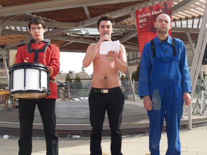 Umjetničkim performansom, simboličnom primopredajom ordenja i njegovim stavljanjem na vlastita prsa, kao i davanjem zakletve Europskoj uniji, jučer točno u podne, pred paviljonom na križevačkom trgu Josipa Jurja Strossmayera otvoren je 8. kulturno-obrazovni festival Culture Shock. Glavni akter i autor “Primopredaje”, performansa kojim je najavljeno dvomjesečje zbivanja u Križevcima, bio je osječko-zagrebački multimedijalni umjetnik Marko Marković, kojem su u izvođenju čina dodjele ordenja asistirali Križevčani Ognjen Petelka u ulozi radnika, davatelja odlikovanja i Domagoj Binder, kao bubnjar, najavljivač događaja.