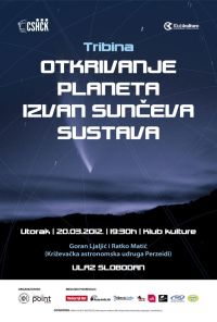 Ove se godine navršava 20 godina od priznatog otkrića prvog planeta koji ne kruži oko Sunca nego oko neke druge zvijezde. Posljednjih godina otkriveno je na stotine takvih planeta. Na tribini će predavači Goran Ljaljić i Ratko Matić govoriti o tim planetima, o povijesti i načinu njihovog otkrivanja i o njihovim karakteristikama, kao i o mogućnostima života na njima. Ulaz na tribinu je slobodan.