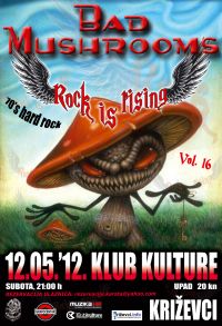 Prije opakih ljetnih vrućina, nakon duljeg vremena, svježi dašak hard rocka s prizvukom sedamdesetih dopuhat će u križevački Klub Kulture, a zove se Bad Mushrooms. Ovi teški rockeri se po prvi puta predstavljaju križevačkoj publici, a i svima onima voljnim potegnuti izvana do Kluba Kulture zasigurno neće biti žao dok će uživati u najboljim stvarima koje je rock uklesao u svevremensku stijenu muzike, a i pokoju autorsku na sličnom tragu. Ovaj rock koncert će se održati sutra, u subotu 12. svibnja 2012. s cijenom ulaznice 20 kuna, a vrata se otvaraju u 21 sat.