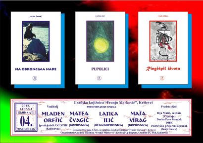 Gradska knjižnica “Franjo Marković” Križevci poziva večeras u 18 sati na predstavljanje knjiga Matee Čvagić, Latice Ilić i Maše Virag iz Koprivnice, uz voditeljstvo Mladena Orešića, predsjednika UG “Stih” iz Kalinovca. Izdanja “Na obroncima nade”, “Pupoljci” i “Ringišpil života” ovih podravskih autorica će predstaviti urednik Ilija Matić iz Županje te Darko Pero Pernjak iz Podravsko-prigorskog ogranka DHK. Tom prigodom će također biti predstavljen višemedijski projekt “Gregory Peck” Ilije Matića, s pripadajućom izložbom starih filmskih plakata istog glumca. Izložba će se moći razgledati na odjelu za odrasle do 29. lipnja. Uz križevačku knjižnicu organizatori su UG “Bagrem” iz Gradišta i UG “Stih” iz Kalinovca.