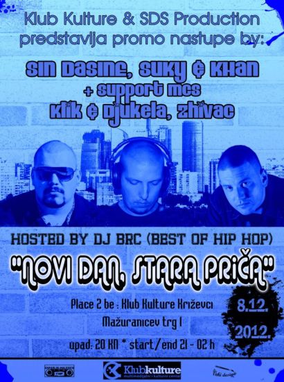 „Novi dan stara priča“ ime je novog albuma križevačkog hip hopera Sin Dasinea koji će svoj uradak promovirati večeras u Klubu kulture u Križevcima. Kao gosti pojavljuju se Suky (aka Suicidal) i Khan – imena sa zagrebačke hip hop scene koja iza sebe imaju poduži staž na našoj sceni. Uz njih na pozornici će se pojaviti i Klik kao aktualni prvak Zagreba na chiLLa’gerOOropez turniru te MC Djukela aka Duga Njuška i Zhivac. Cjelokupni događaj popratiti će DJ Brc svojim izborom klasika hip hopa. Ulaz je 20 kuna, a program koji predstavlja SDS Produkcija kreće od 21 sat.