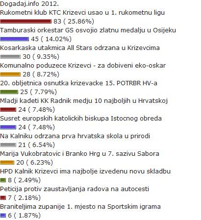 Nakon što je u subotu u ponoć završeno glasovanje za Osobu.info i Događaj.info u sklopu 8. revijalnog internetskog izbora za osobu i događaj godine u Križevcima, posjetitelji portala Križevci.info su s ukupno 321 glasom birali događaj godine, a za pobjednika izabrali ulazak Rukometnog kluba “KTC” u 1. rukometnu ligu! Ovom vrhunskom sportskom podvigu pobjedu je osigurala četvrtina svih glasova u anketi, što je križevački rukometni klub s tradicijom dugom gotovo šest desetljeća itekako zaslužio. Kvalitetu kluba koji čvrstu osnovu ima u domaćim igračima čitatelji su rado prepoznali i ovim putem nagradili titulom Događaj.info 2012.