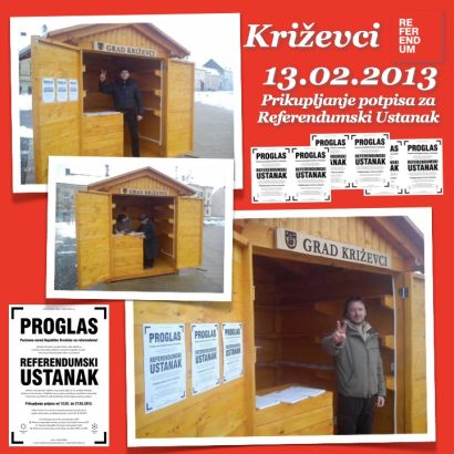 Od 13. pa sve do 27. veljače 2013. građanska inicijativa “Referendumski ustanak” u pedesetak gradova Hrvatske prikuplja potpise za izjašnjavanje potrebe za raspisivanjem referenduma sa sljedećim pitanjima: 1. Jeste li za poništenje pretvorbe i privatizacije? 2. Jeste li za zabranu rasprodaje imovine, prostora i prirodnih resursa Republike Hrvatske? 3. Jeste li za zabranu prometovanja, proizvodnje i prodaje GMO-a u Republici Hrvatskoj? 4. Jeste li za članstvo Republike Hrvatske u Europskoj Uniji? Prema informacijama organizacijskog Odbora, u prva dva dana prikupljeno je po cijeloj Hrvatskoj oko 10 tisuća potpisa po svakom pitanju, što je ukupno oko 40 tisuća potpisa za sva četiri pitanja. Aktivisti u Križevcima potpise prikupljaju na Strossmayerovom trgu.