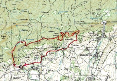 Pohod ide iz središta Gornje Rijeke stazom 10 (po Smandu) te se ide zapadno cestom do skretanja u vinograd, zatim desno do prvog slapa kroz živopisni krajolik. Poslije prolaska kroz klanac Šokot s više manjih ili većih slapova dolazi se do livada Bezđe, od njih se južno kroz šumu uspinje na brdo Belu Goricu. Od križanja puteva šumovitim grebenom stazom istočno do vidikovca na stijeni Kanclin (421 m). Nakon kraćeg odmora ide se dalje na istok do vidikovca Križnog Kamena, gdje je predviđen dulji odmor. Spuštanje stazom 10b do slapova u potoku Deklišanec (Pesji potok), od njih desno uspon do vidikovca Rani kamen na stijeni. Od njega istočno stazom uz stjenovito šumoviti greben Puste Barbare do podnožja i velike livade. Tu se lijevo staza uspinje na Pustu Barbaru (460 m), gdje su desno istočno ostaci grada Mali Kalnik. Lijevo je odmorište za ručak iz ruksaka. Poslije silazak stazom 11 (po Smandu) u selo Deklešanec, te povratak cestom u Gornju Rijeku. Moguće se je odvojiti i produžiti do planinarskog doma na Kalniku stazama 4b, zatim staza 1(trasa ZPP-a) grebenom Sljeme, livadom Velike sjenokoše, zatim Poučnom stazom staza broj 18.