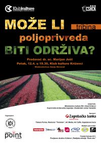 U petak 12. travnja s početkom u 19:30 sati u križevačkom Klubu kulture se u sklopu 9. Culture Shock Festivala održava tribina „Može li poljoprivreda biti održiva?”. O ovoj temi će govoriti prof.dr.sc. Marijan Jošt, jedan od najpoznatijih hrvatskih protivnika GMO-a, umirovljeni profesor Visokog gospodarskog učilišta u Križevcima, te ispričati zašto je danas više nego ikad aktualno i potrebno govoriti o problemima genetski modificirane hrane i drugih proizvoda. Moderatorica tribine je Sanja Novosel, a ulaz je slobodan.